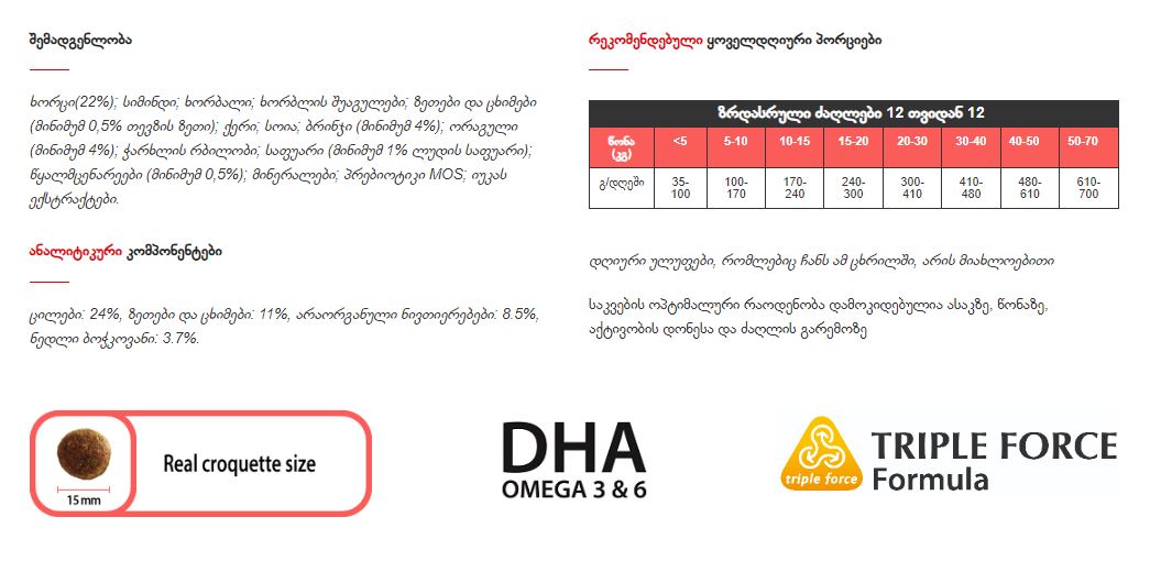 Crude protein: 24%, Crude oils & fats: 11%, Inorganic matter: 7%, Crude fibres: 3.5%, Omega-3 fatty acids: 0.1%, DHA&EPA: 0.03%.